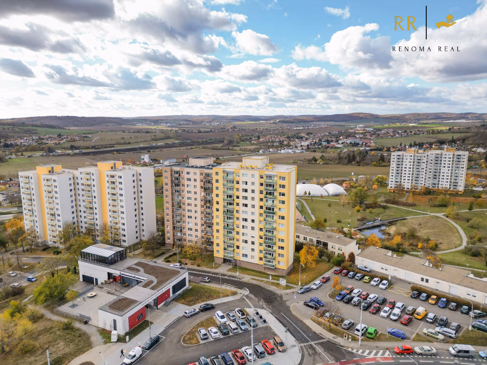 Obývací pokoj, kuchyně a jeden z pokojů směřují na západ a nabízí krásný výhled do udržovaného parku s jezírkem, zelení a dětskými hřišti, ostatní pokoje směřují na východ/jih.