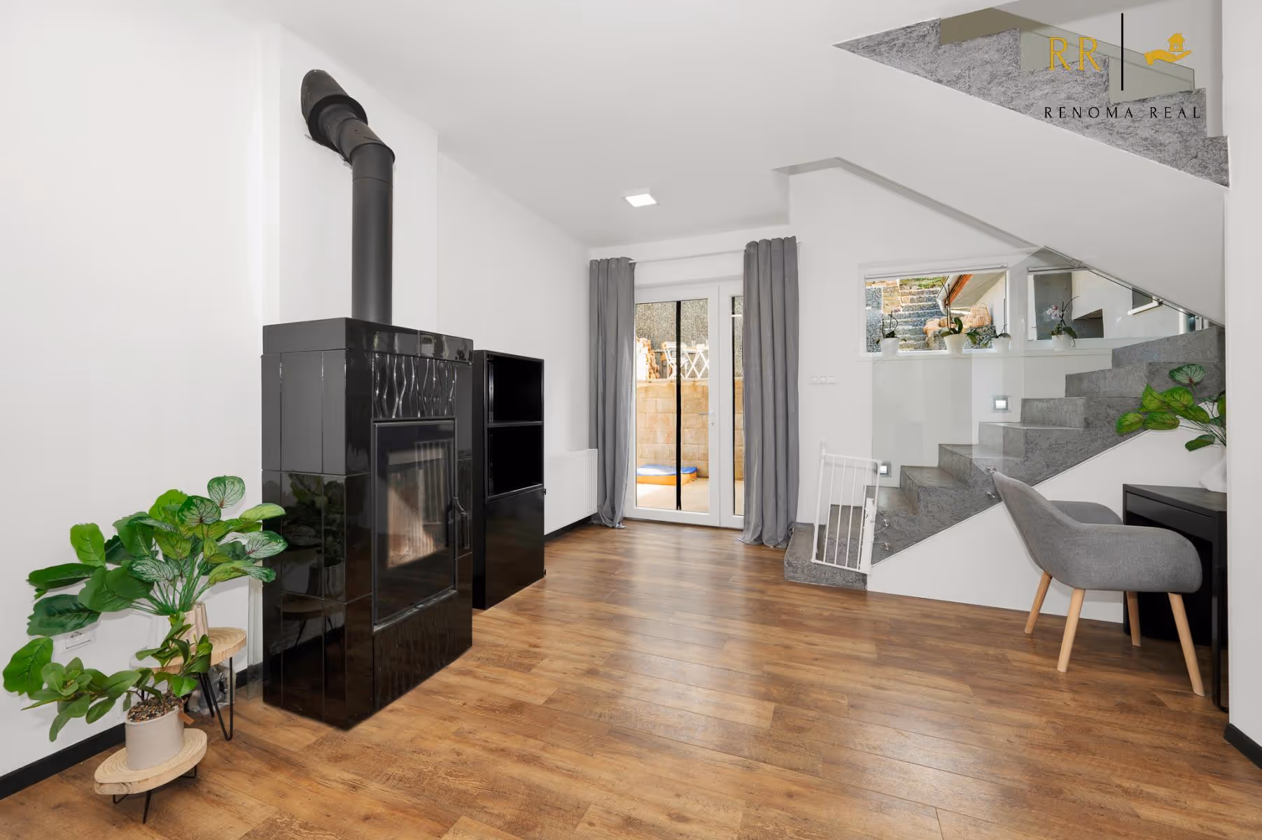 Dům je vybaven kvalitními a moderními materiály, včetně nových podlah, dveří, stylového nábytku, krbových kamen, plně vybavené kuchyňské linky se spotřebiči, koupelny s elektrickým podlahovým vytápěním, vanou i sprchovým koutem a designovým schodištěm se skleněným zábradlím.