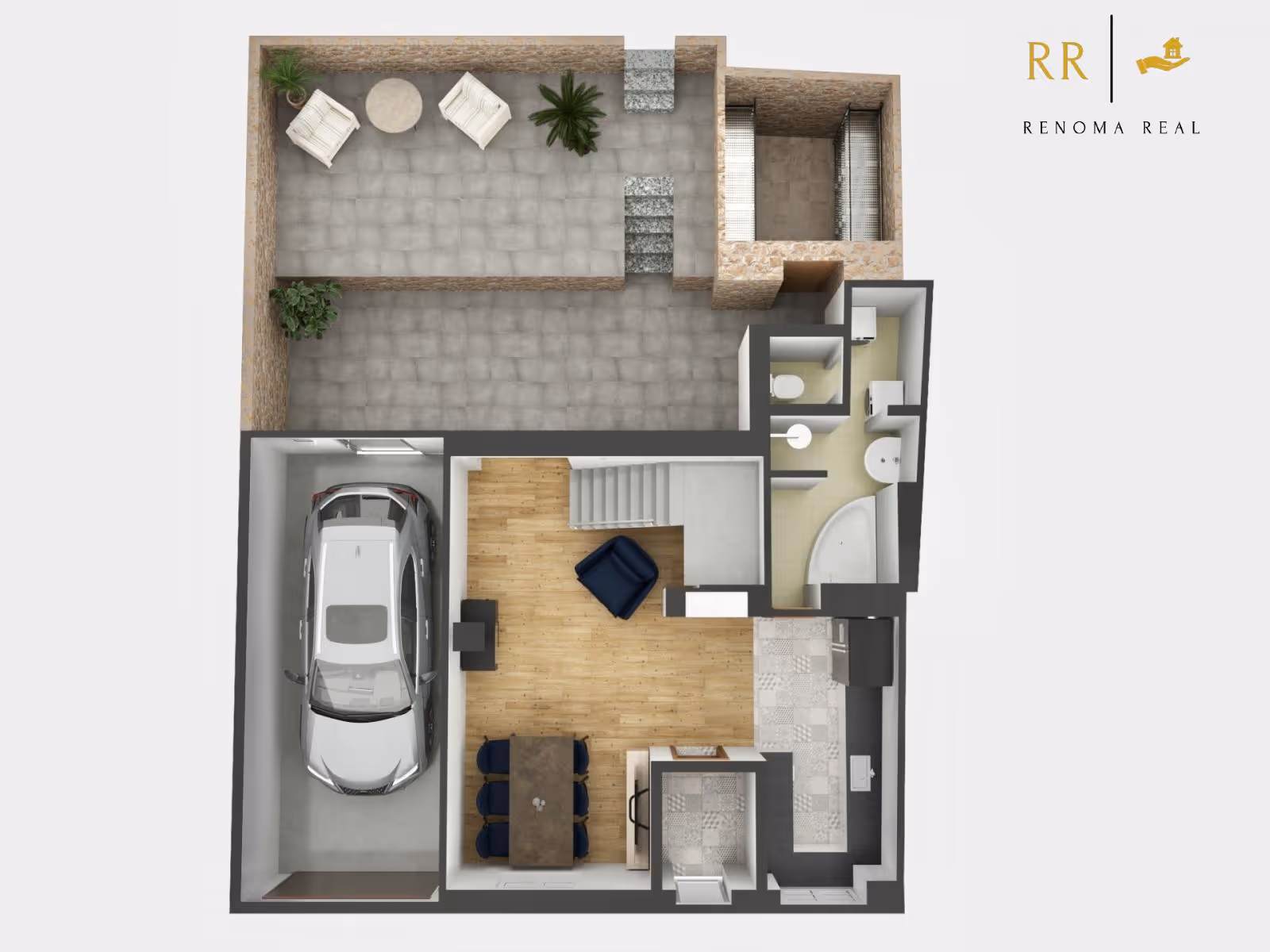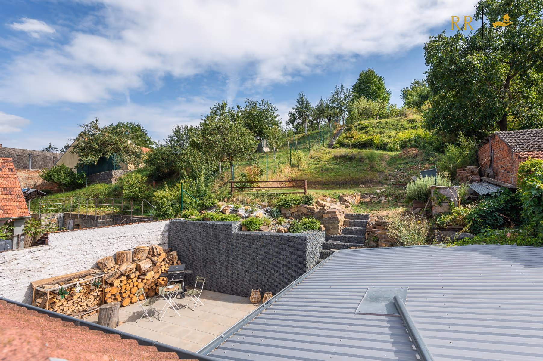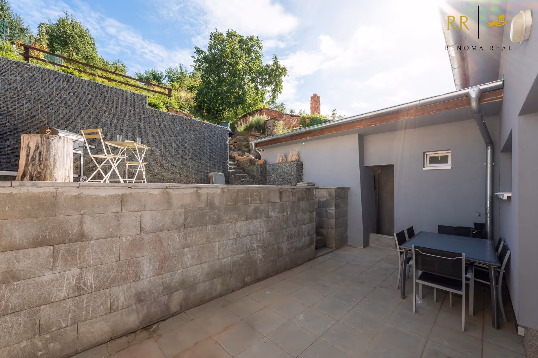 K nemovitosti náleží oplocený pozemek o rozloze 550 m2 s víceúrovňovou zahradou, garáží s automatickými vraty a prostornou terasou.