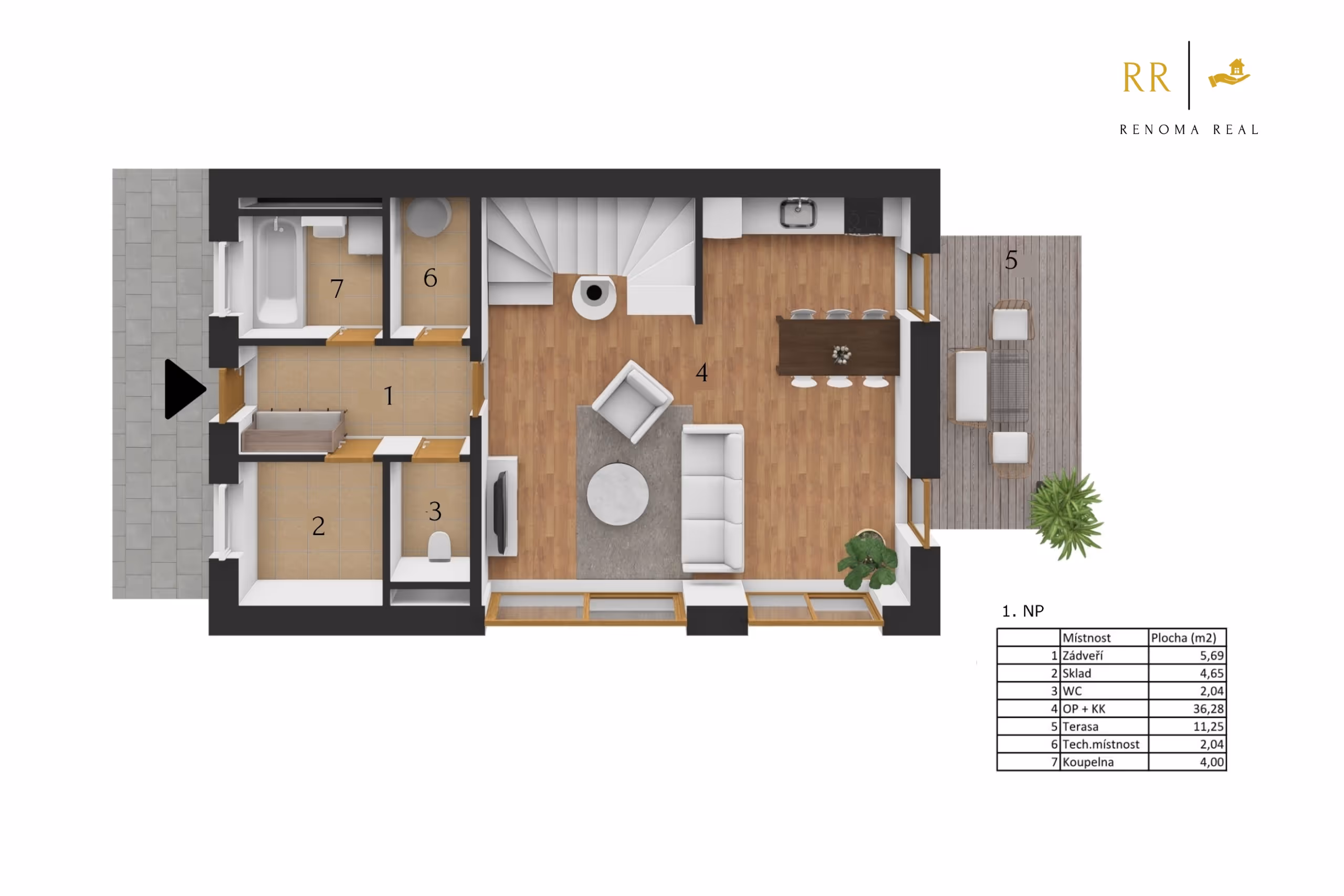 V přízemí se nachází prostorný obývací pokoj s kuchyní a vstupem na terasu, koupelna, samostatné WC, technická místnost a sklad. V patře pak najdete další dva pokoje a otevřenou galerii (při včasné rezervaci je možné vybudovat další pokoj, a to bez navýšení ceny!). K domu náleží zahrada, terasa a dvě parkovací stání.