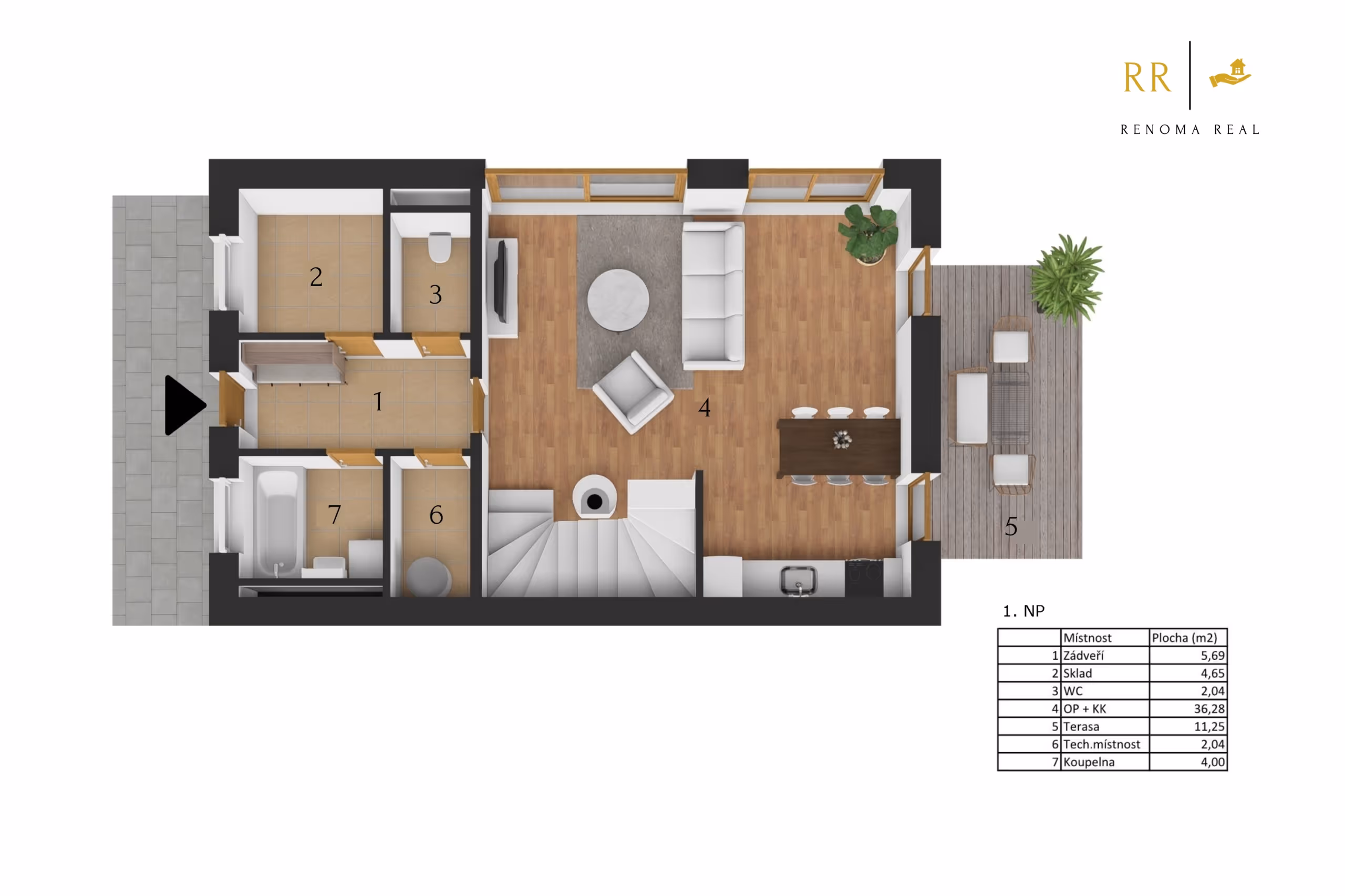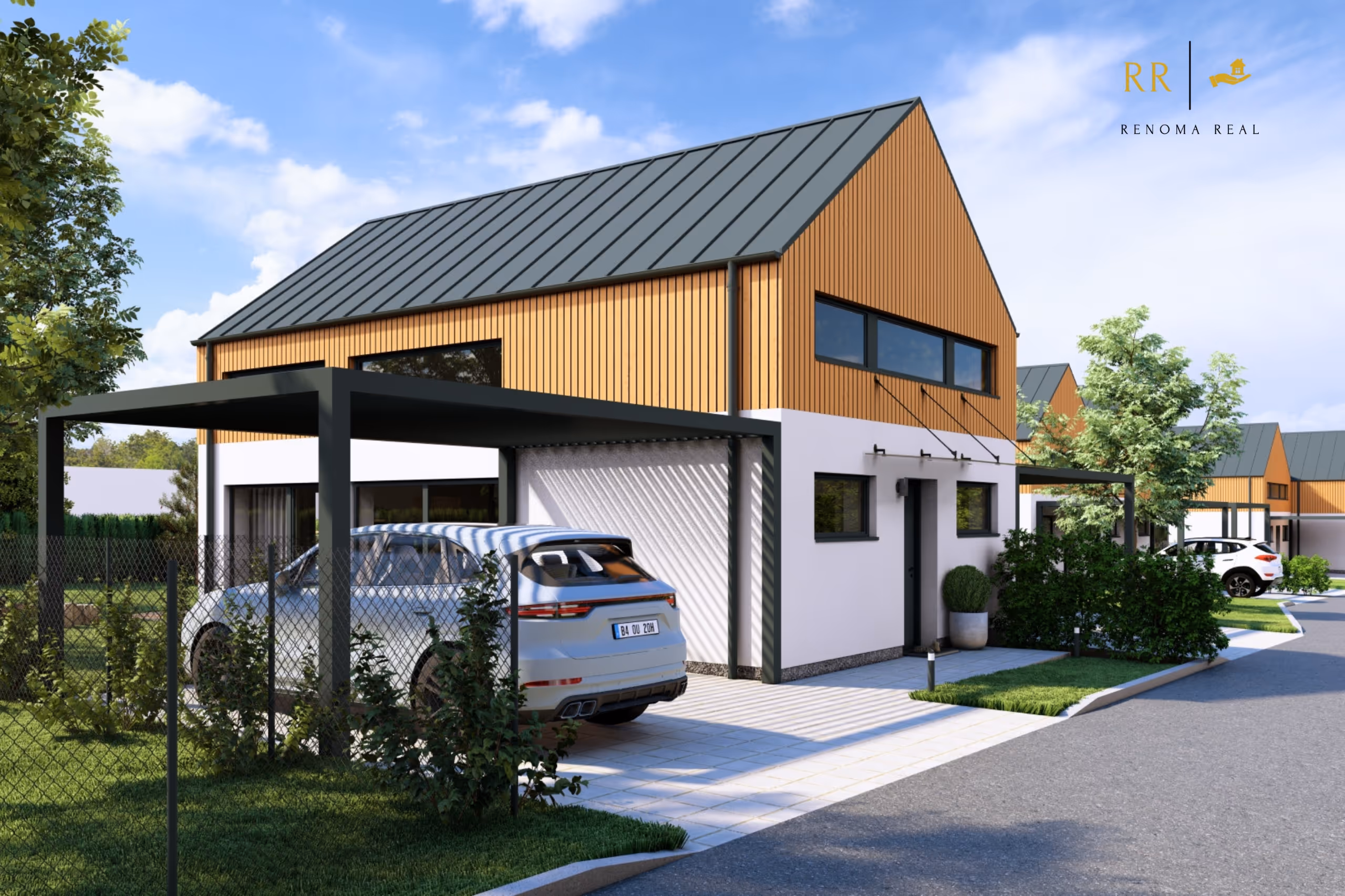 V přízemí se nachází prostorný obývací pokoj s kuchyní a vstupem na terasu, koupelna, samostatné WC, technická místnost a sklad. V patře pak najdete další dva pokoje a otevřenou galerii (při včasné rezervaci je možné vybudovat další pokoj, a to bez navýšení ceny!). K domu náleží zahrada, terasa a dvě parkovací stání.