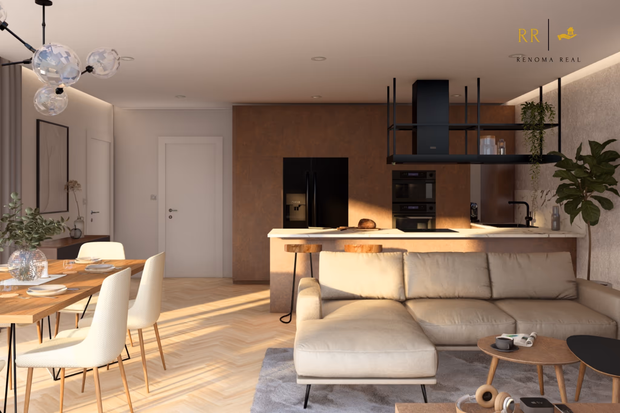 Prostorný obývací pokoj s kuchyní a vstupem na terasu, dvě samostatné ložnice, koupelna, samostatné WC, technická místnost, chodba.
